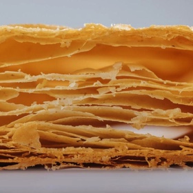 Si hemos respetado tiempos de reposo, y hemos conseguido una buena plasticidad de masa y mantequilla, estamos seguros que vamos a tener 108 capas de mantequilla, las cuales nos van a dejar bien claro que el horno cocina perfectamente: habrá láminas finas, no sólo capas de mantequilla, habrá las mismas capas más masa y hojaldrado, algo, por regla general, que se trabaja muy poco en el amasador. Se ve claramente cómo la masa va a quedar muy refunada en laminadora, después de tantas pasadas. Una vez hayamos reposado al mínimo 2 horas en nevera (o máximo de 24 horas) es la hora de empezar a formar nuestras piezas.